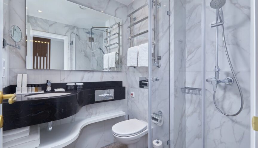 Санузел оснащён душевой кабиной, в нём есть туалетные принадлежности, фен и халат.