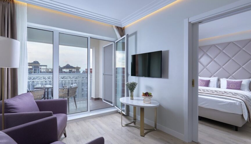 Двухкомнатный люкс площадью 44 квадратных метра с балконом, обставленным мебелью. В номере есть двуспальная кровать, кресла, вешалка, зеркало, прикроватные тумбочки, стол и шкаф.