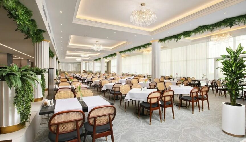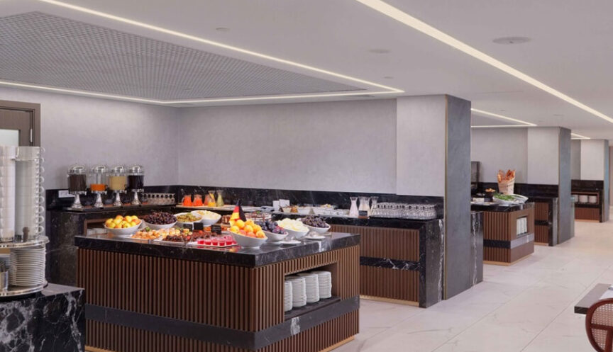 Ресторан вмещает до 300 человек и предлагает шведский стол с блюдами 14 кухонь из 26 стран. Для детей есть отдельная зона с удобной мебелью, игровым уголком и трансляцией мультфильмов.